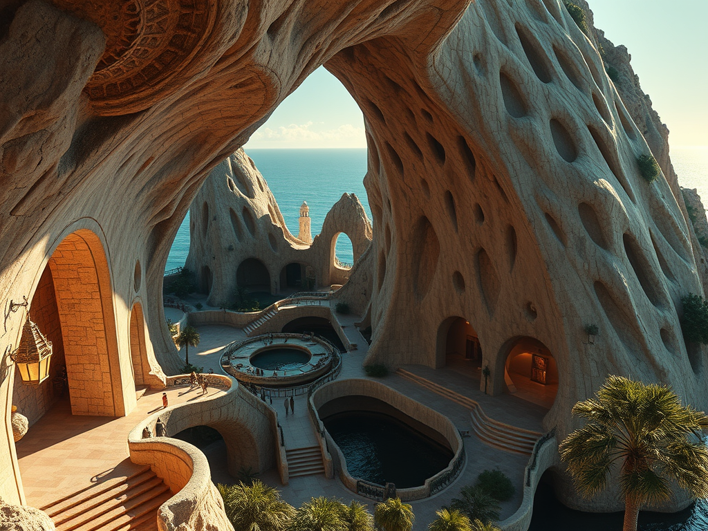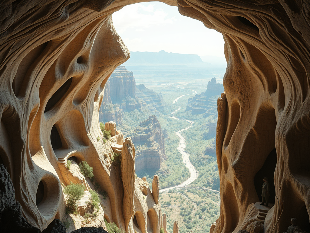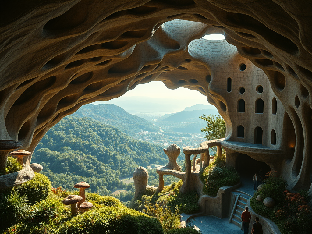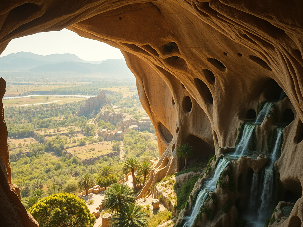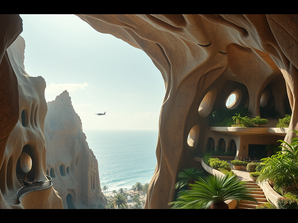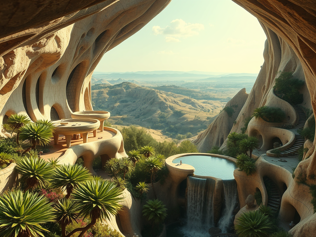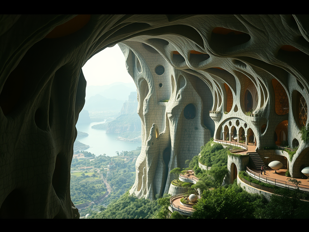 Above: Artist’s impression, generated by OpenAI, of the coming era, in which humans will no longer primarily live in coastal areas, but in mountains and rock formations, as they did in prehistoric times. The impressions are often imperfect in detail. They are partly inspired by my visit in 2024 to the area around the Aasvoelkrans Cave, Kwazulu-Natal, South Africa.