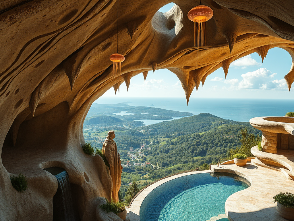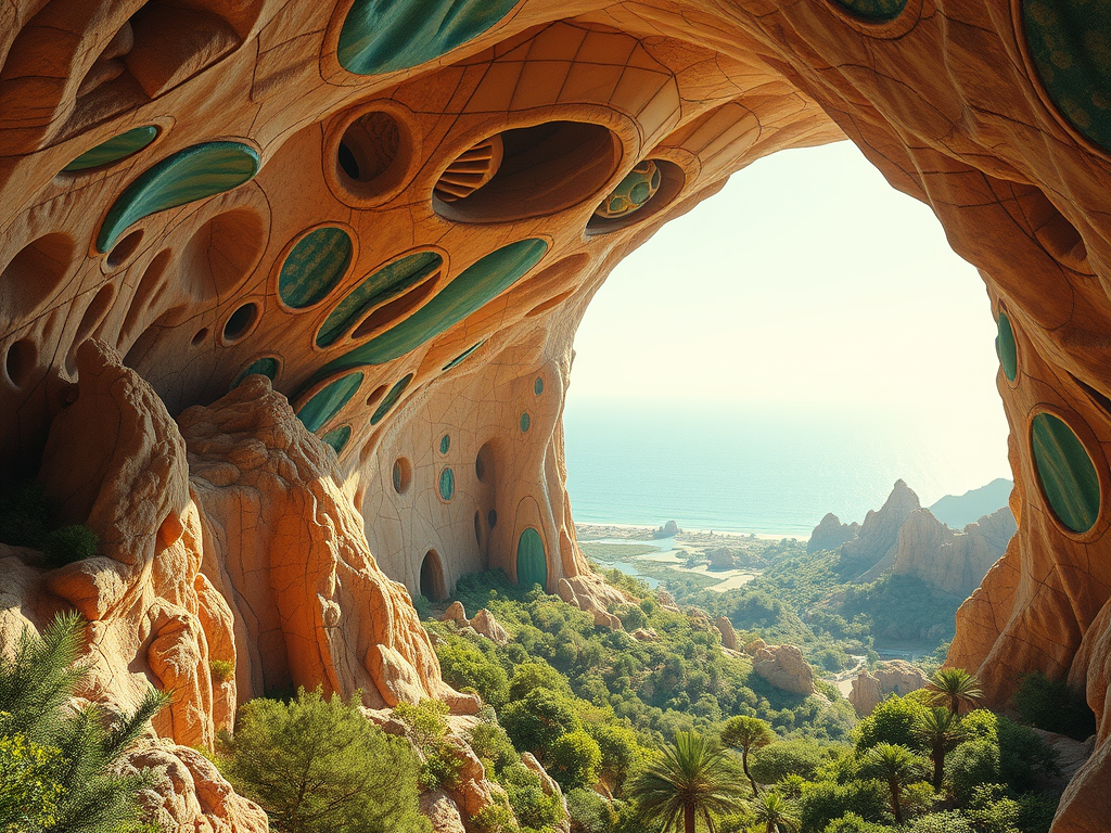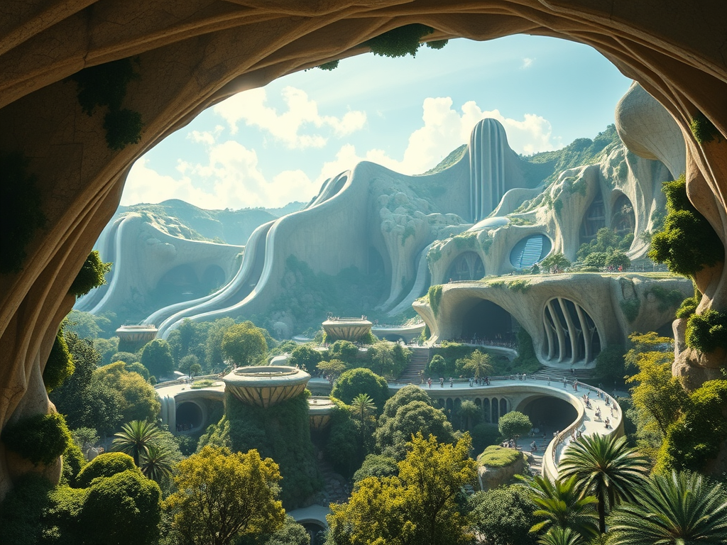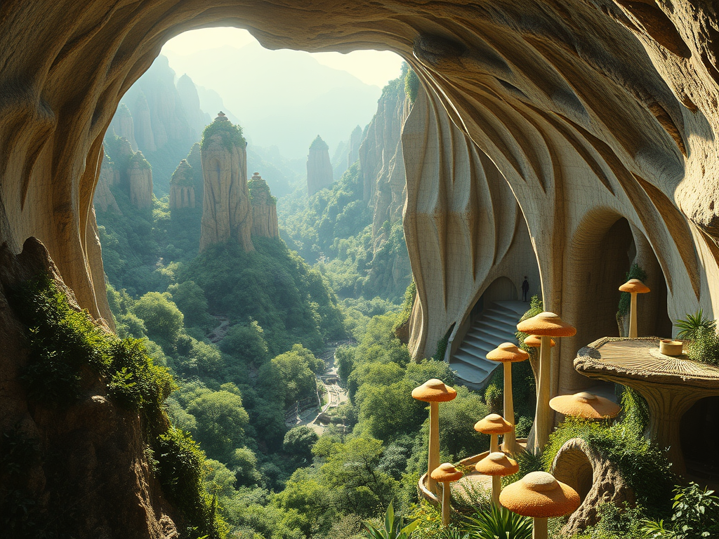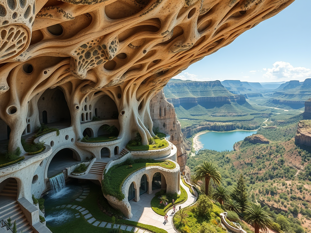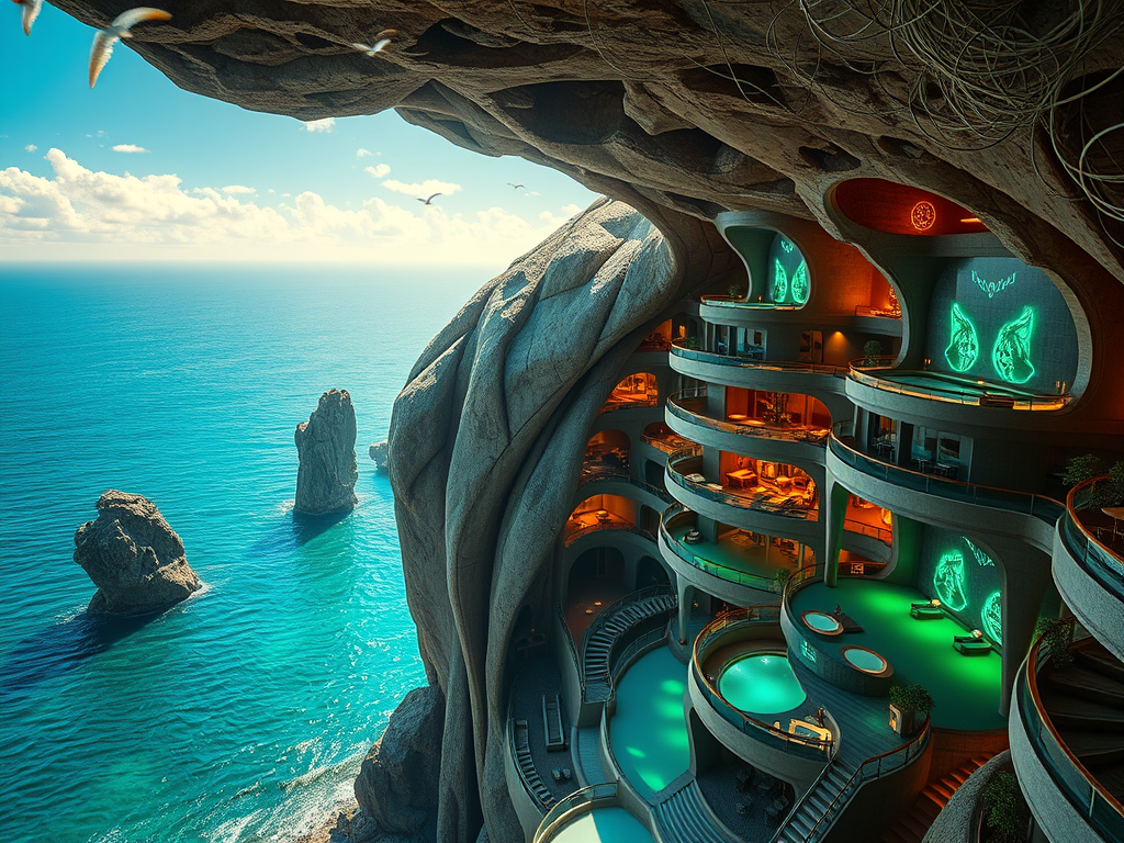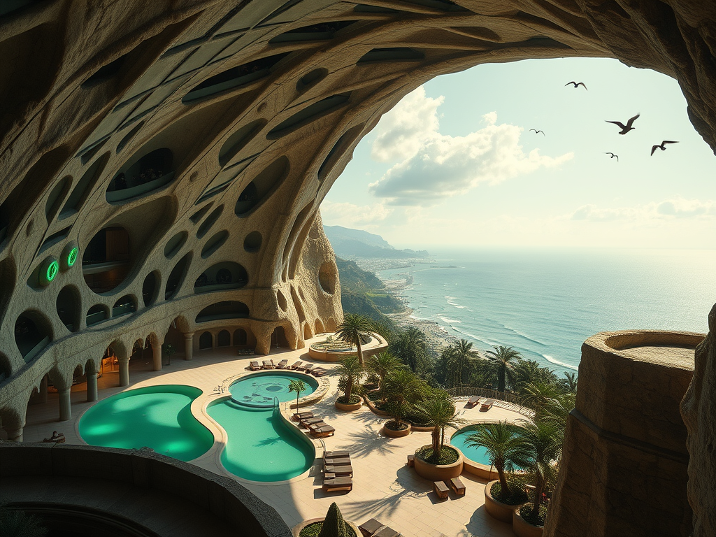 Above: Artist’s impression, generated by OpenAI, of the coming era, in which humans will no longer primarily live in coastal areas, but in mountains and rock formations, as they did in prehistoric times. The impressions are often imperfect in detail. They are partly inspired by my visit in 2024 to the area around the Aasvoelkrans Cave, Kwazulu-Natal, South Africa.