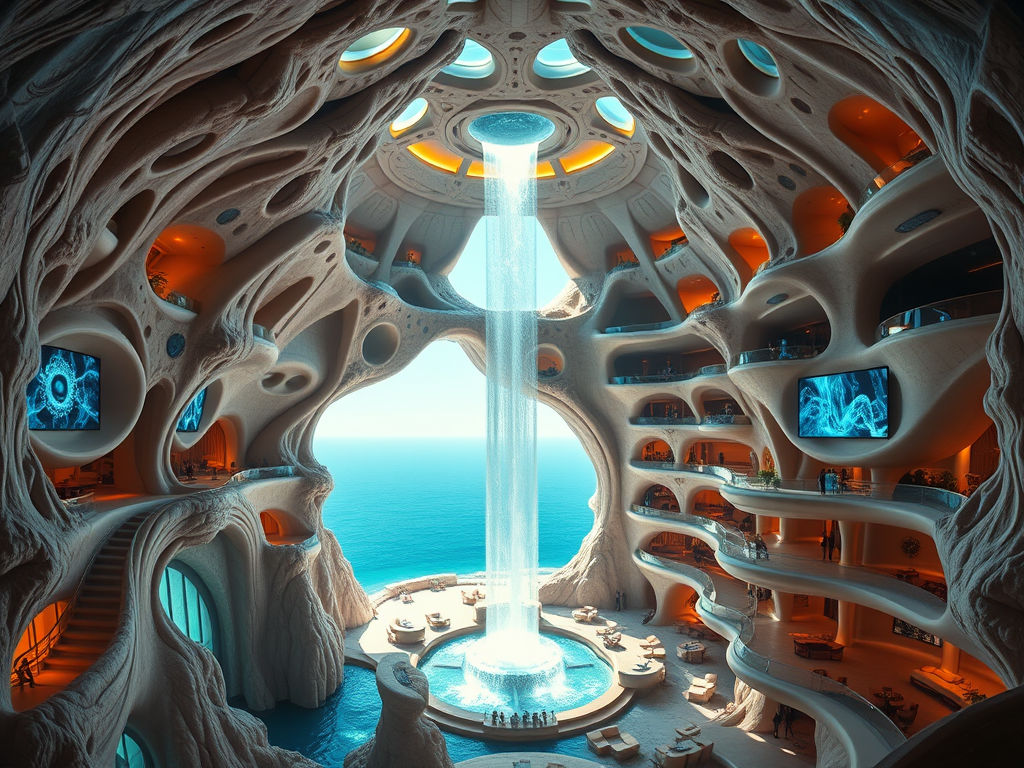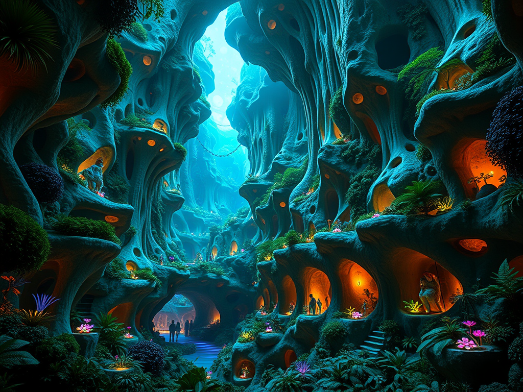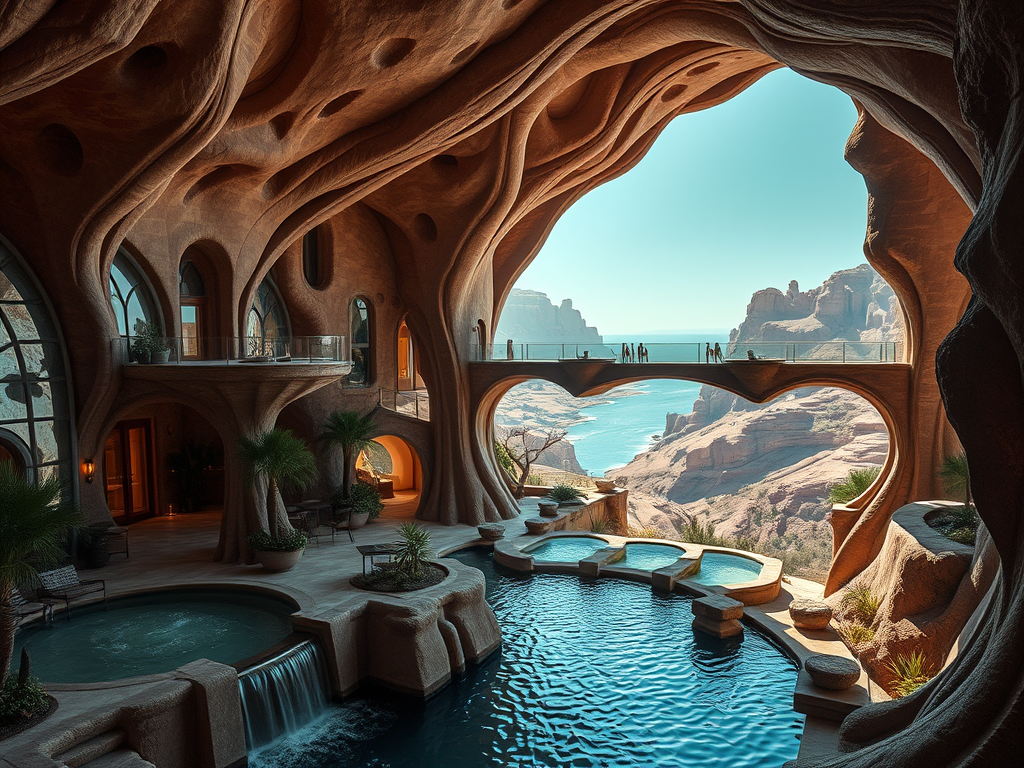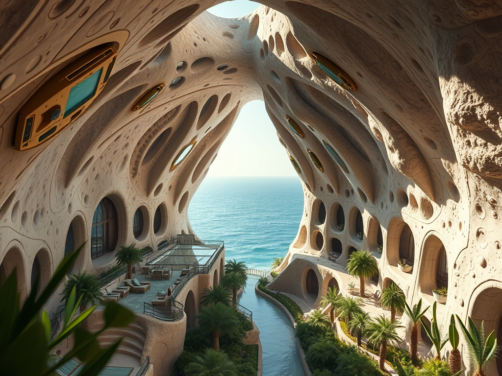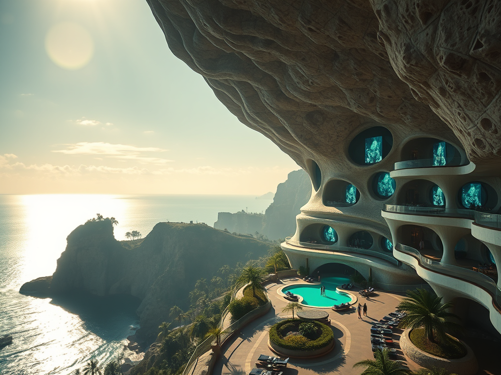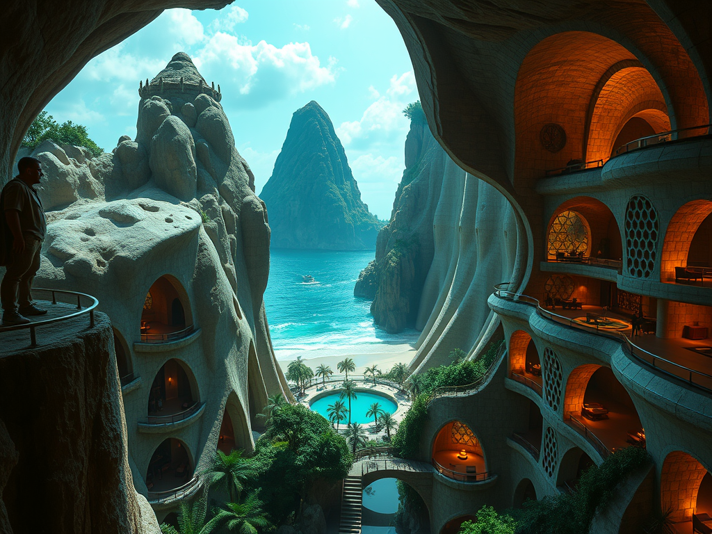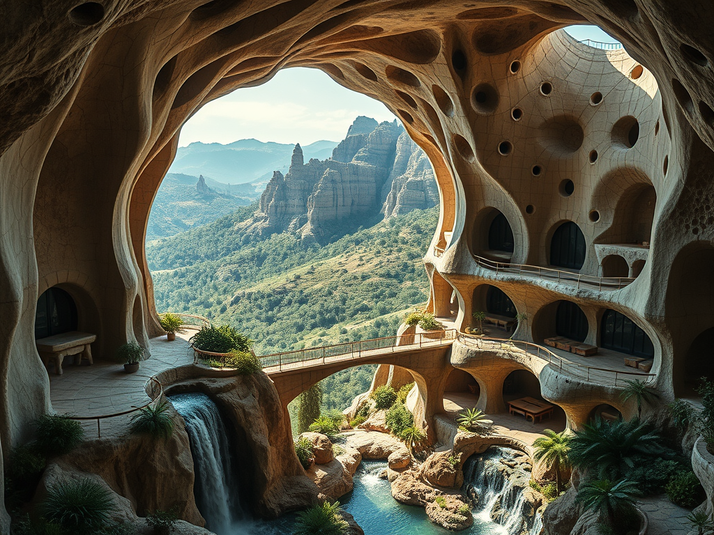 Above: Artist’s impression, generated by OpenAI, of the coming era, in which humans will no longer primarily live in coastal areas, but in mountains and rock formations, as they did in prehistoric times. The impressions are often imperfect in detail. They are partly inspired by my visit in 2024 to the area around the Aasvoelkrans Cave, Kwazulu-Natal, South Africa.