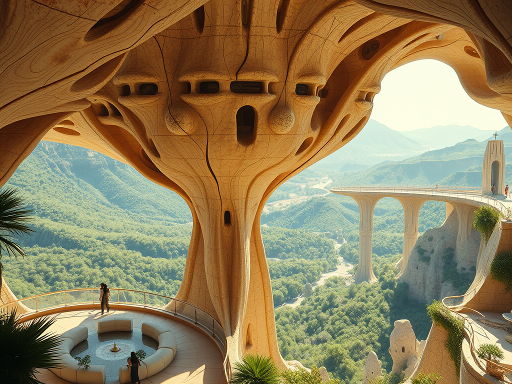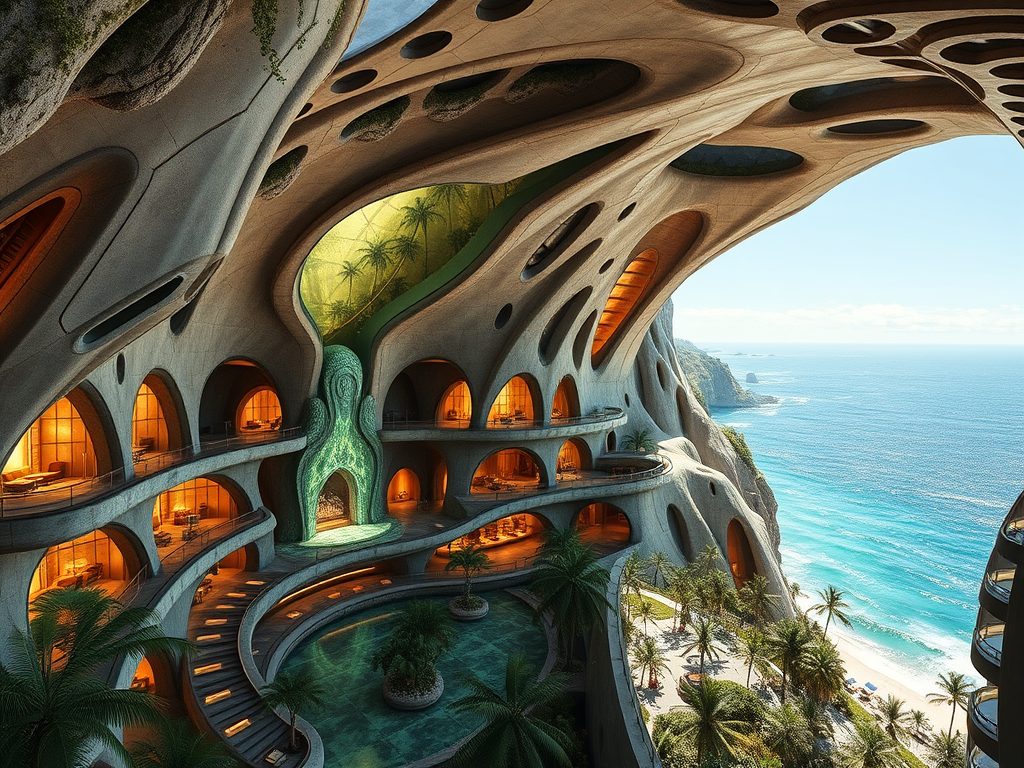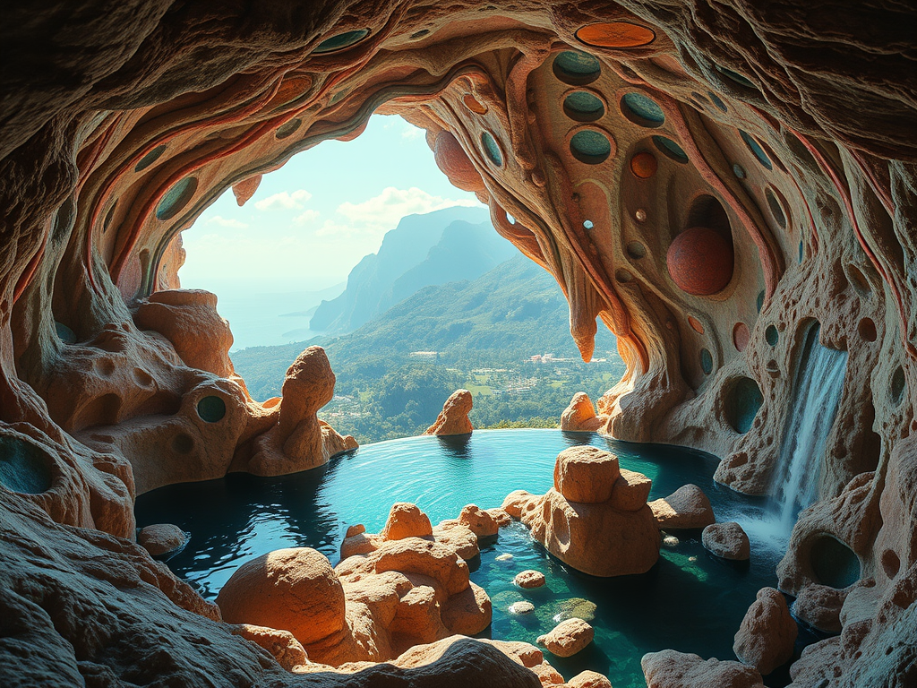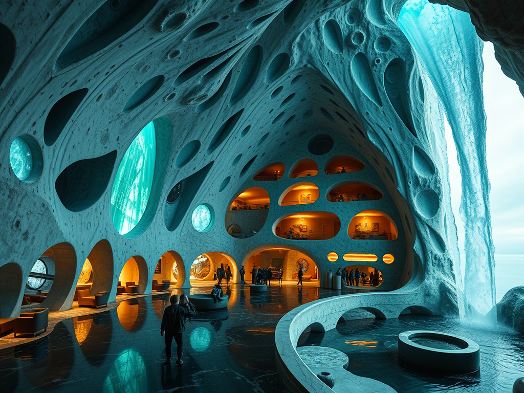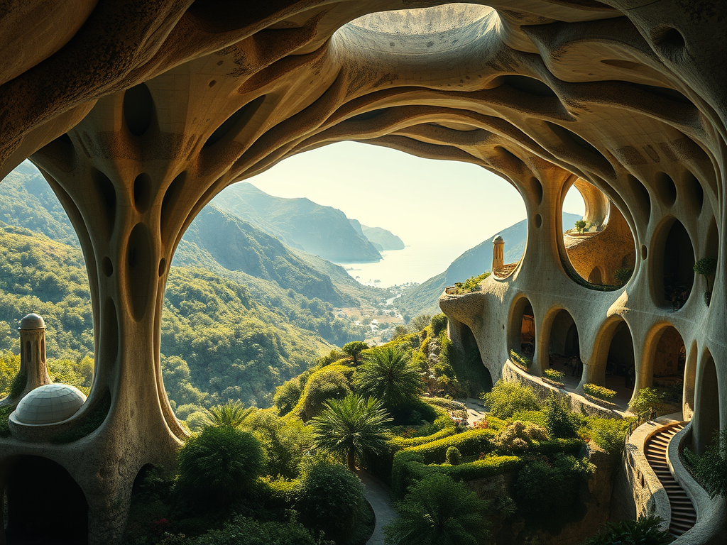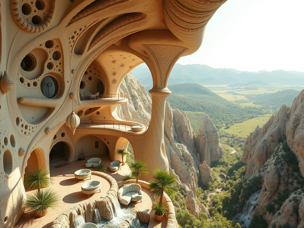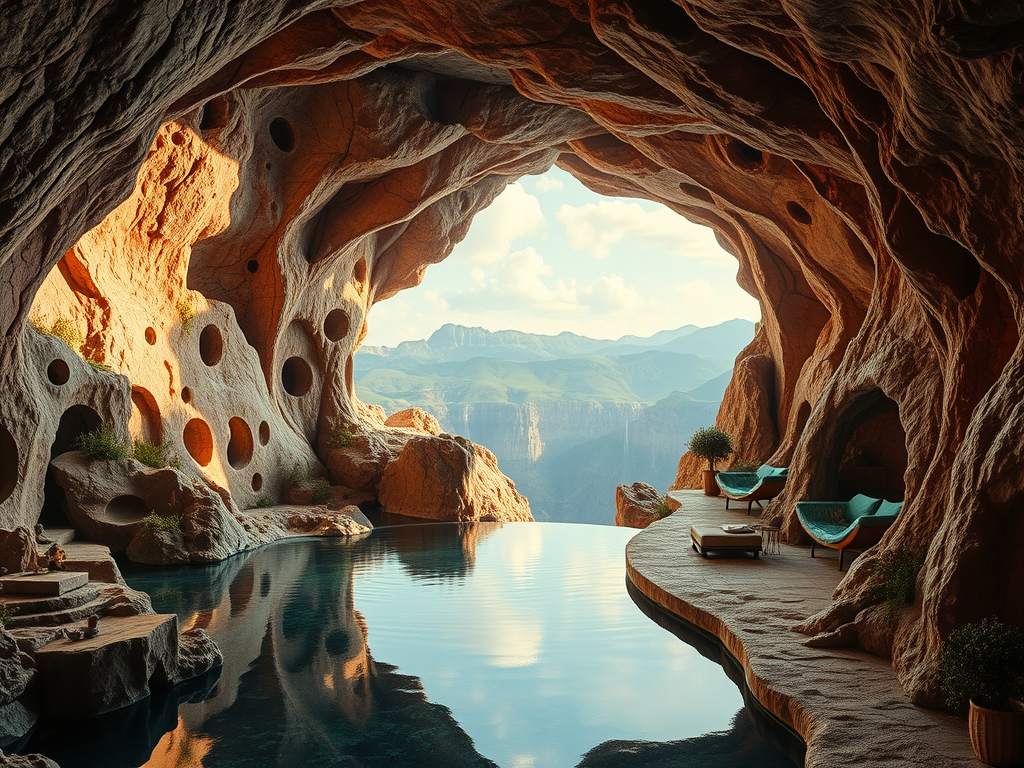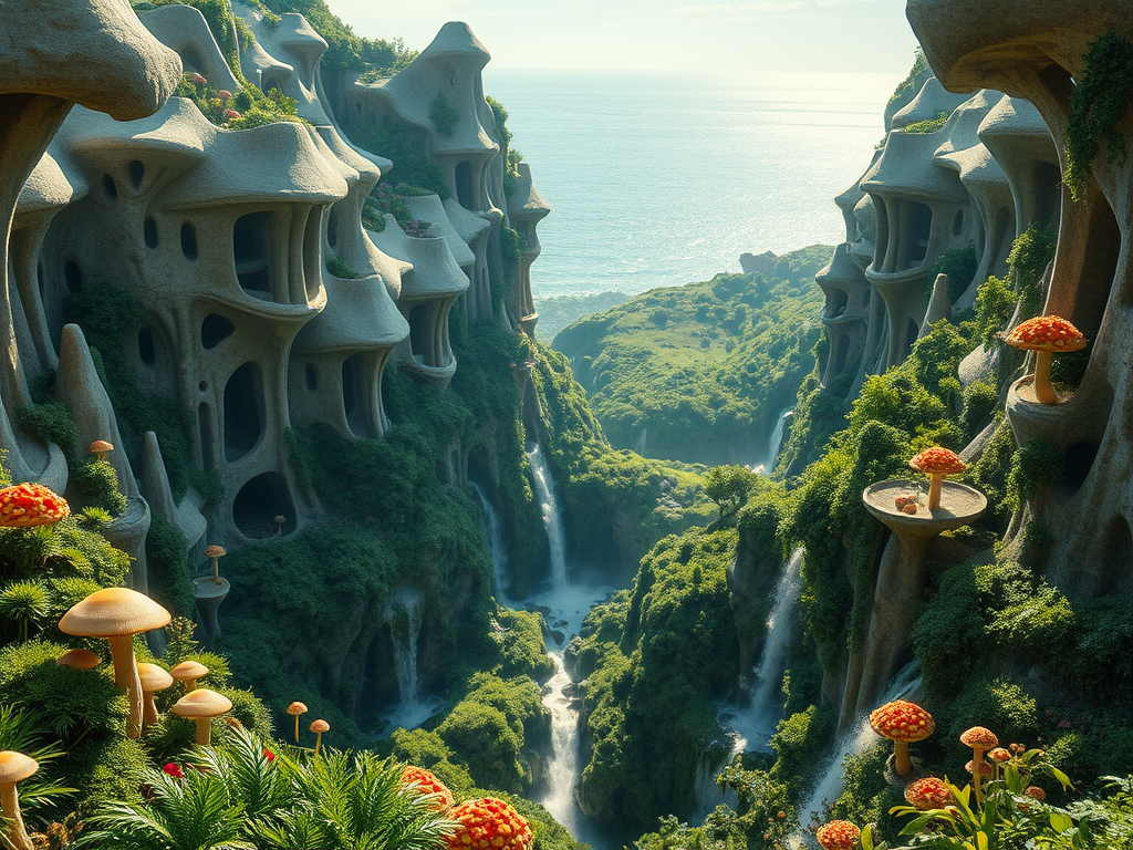 Above: Artist’s impression, generated by OpenAI, of the coming era, in which humans will no longer primarily live in coastal areas, but in mountains and rock formations, as they did in prehistoric times. The impressions are often imperfect in detail. They are partly inspired by my visit in 2024 to the area around the Aasvoelkrans Cave, Kwazulu-Natal, South Africa.
