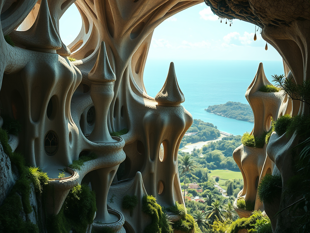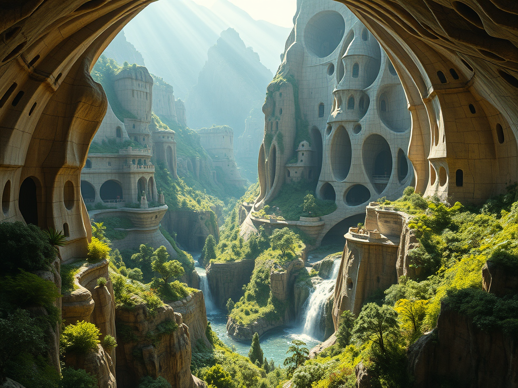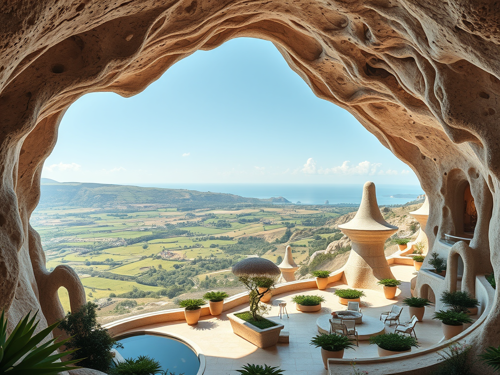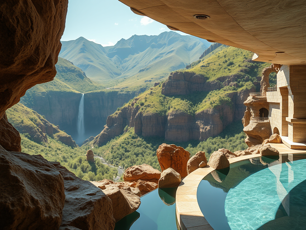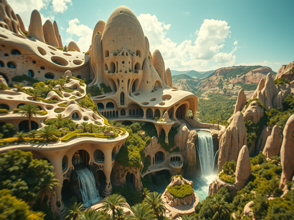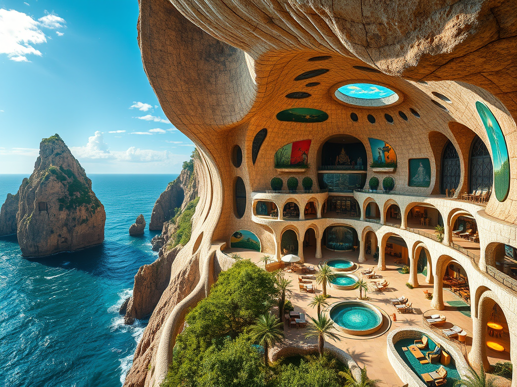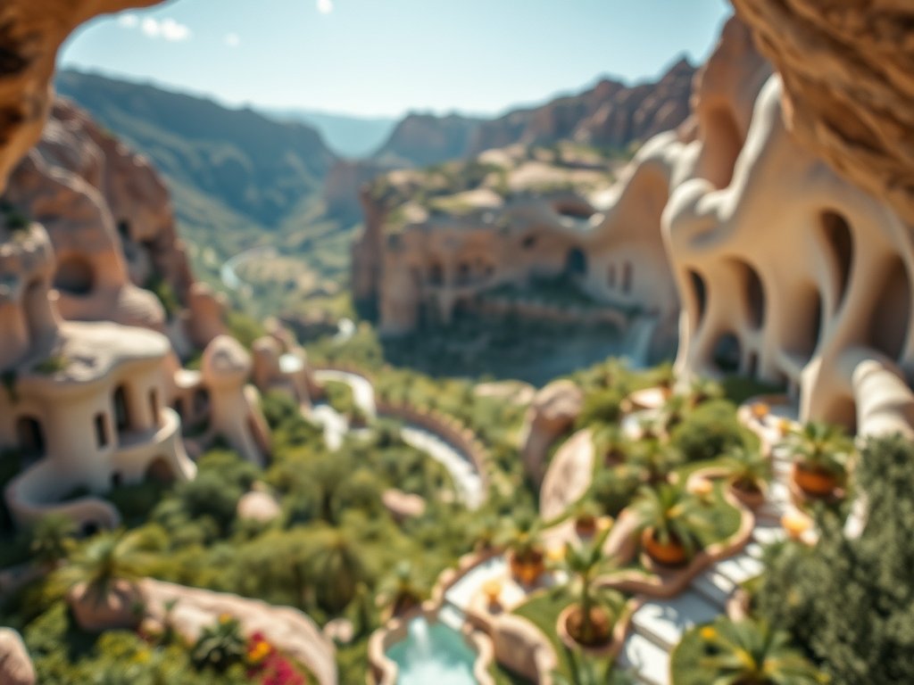Above: Artist’s impression, generated by OpenAI, of the coming era, in which humans will no longer primarily live in coastal areas, but in mountains and rock formations, as they did in prehistoric times. The impressions are often imperfect in detail. They are partly inspired by my visit in 2024 to the area around the Aasvoelkrans Cave, Kwazulu-Natal, South Africa.